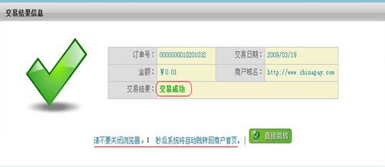 确认信息无误后再次按“确认”按钮,进入银联跳转页面,并打开银联支付页面,选择银行。考生可以根据弹出框了解到所选银行卡的说明。比如:支付限额、支持卡种、以及如何申请网上支付功能。确认后进入银行网银页面,填写银行卡号。如果需要,请先安装对应银行的相关插件,否则可能导致验证码无法正常显示。根据提示,输入密码、确认支付信息无误后,点击“提交”。 提交后,银行返回“支付成功”,表示考生银行卡已扣款。系统提示“是否跳转到商户页面”点击确认后,出现如下页面。(图中为一笔0.01元的测试交易,订单号为:0000000010201032 交易日期:2009-3-19)