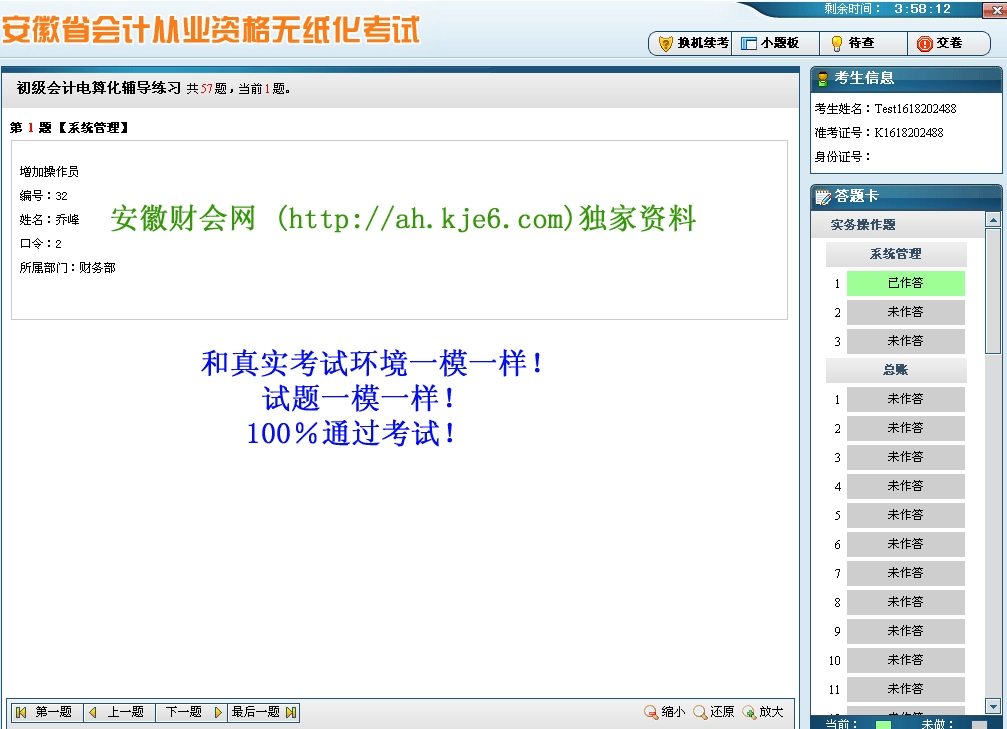 (2012年安徽省财政厅指定会计电算化考试专用系统)